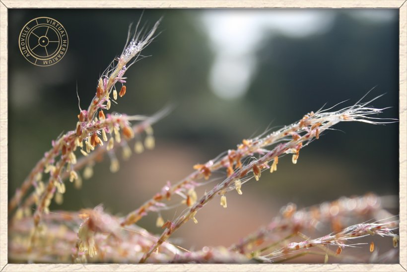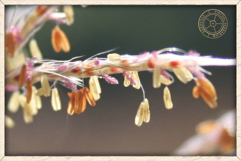 Imperata cylindrica florets with yellow hanging anthers and pink pistils