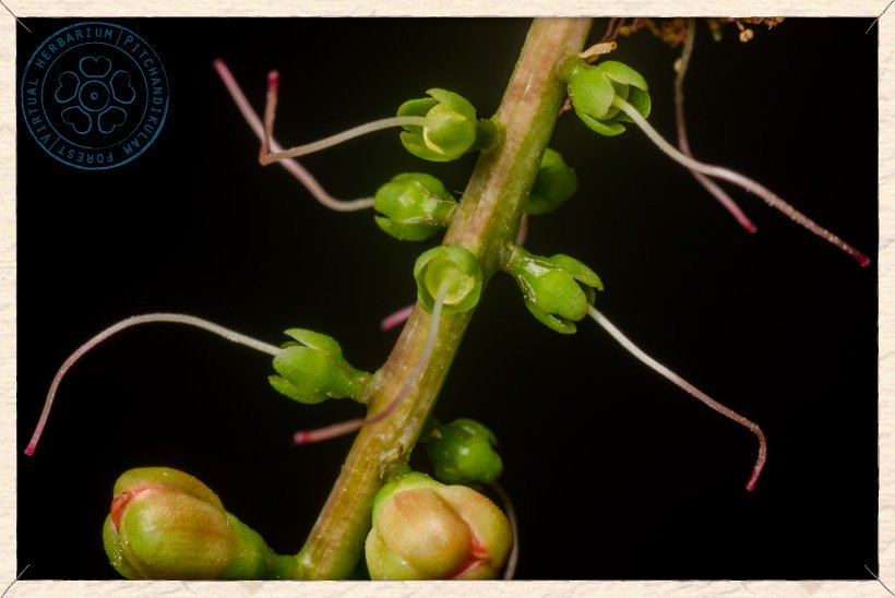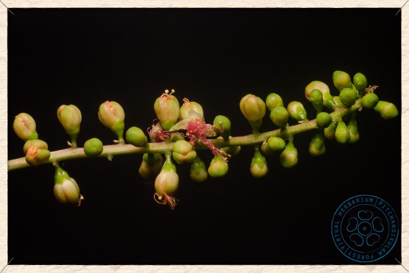 The flowers of Barringtonia acutangula are grouped in long and pendulous racemes up to 30-40 cm long.