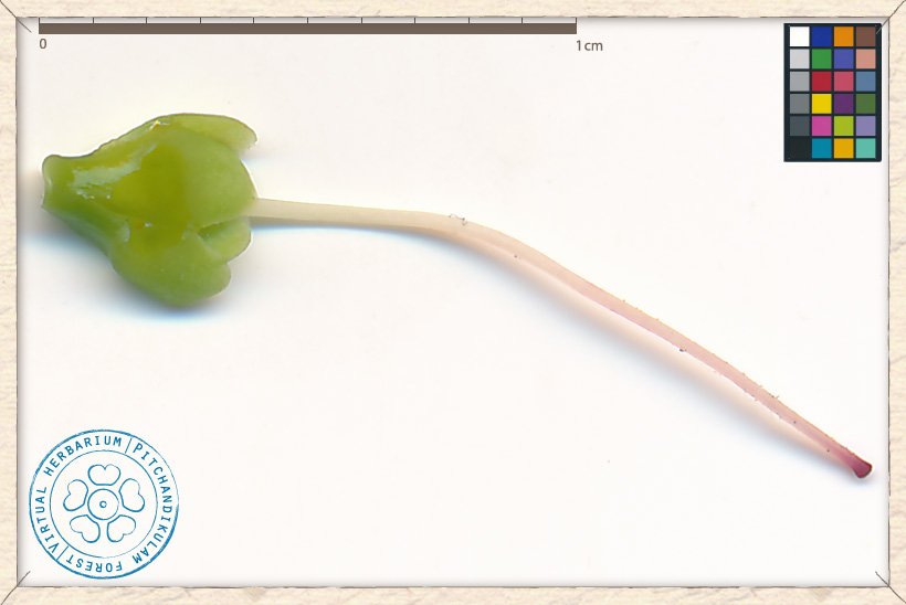 The calyx-tube is cup-shaped, 4-lobed and 3 mm long and 3 mm across. The calyx is light green and glabrous.