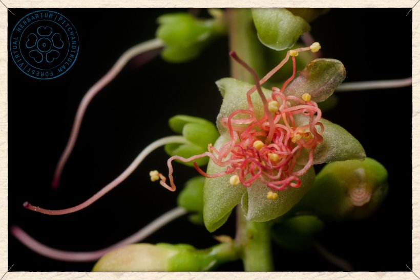 The androecium is composed of numerous stamens in several rows. The filaments are 1 cm long, filiform and pink. The anthers are globular and 0.5 mm across.