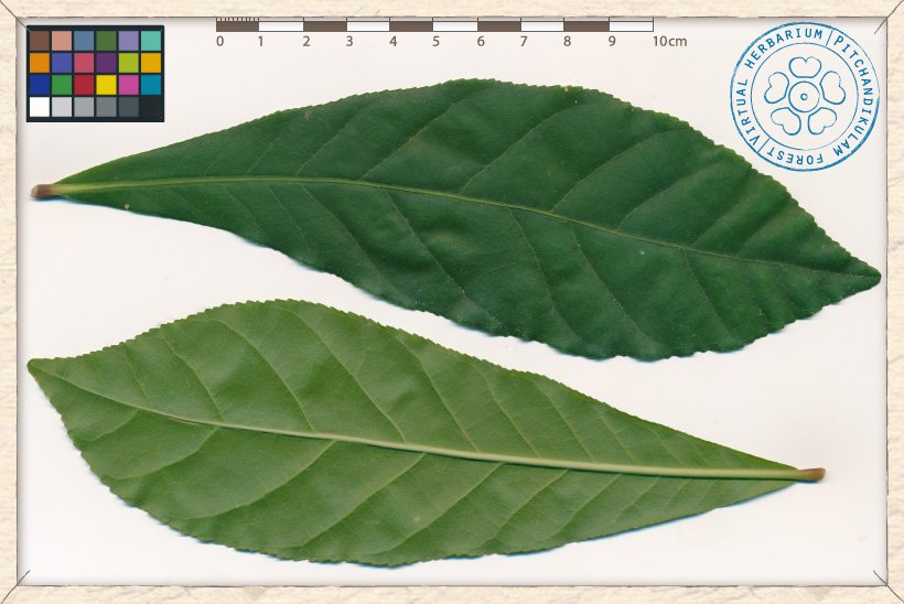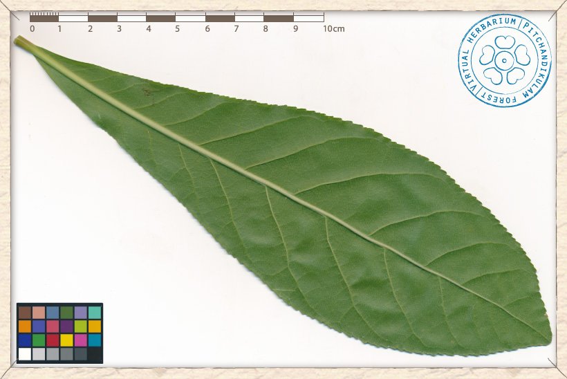 The leaf of Barringtonia acutangula is about 10-20 cm long and 3-6 cm wide. The shape of the blade is oblanceolate or obovate, the apex is acute, the base is cuneate and the margins are serrate.